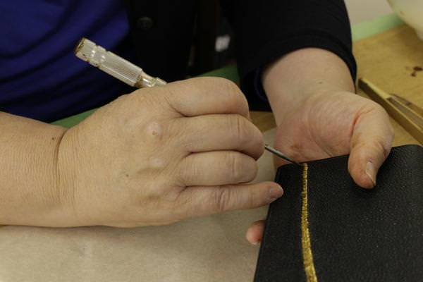 開発中に大事にしたのはレザー製品ですから長くご利用して頂く事を考えて、金箔が簡単に剥がれないように何度もテストをしました。その間、何人かの職人には加工を断られたりして開発に2年半かかりました。